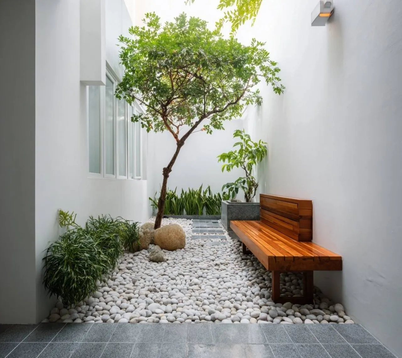 In Koh Samui, humidity and tropical rain can make grass maintenance difficult in shaded areas. A stone garden using river pebbles and limestone slabs creates a clean, sophisticated look that drains well and requires zero mowing.